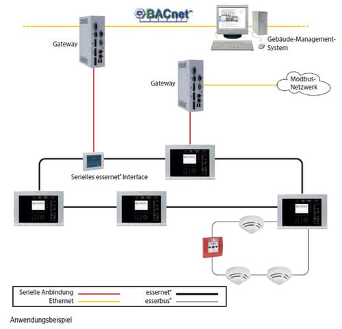 Das essernet® ist ein kurzschluss- und unterbrechungstoleranter 2-adriger Systemringbus zur Vernetzung von Brandmelde- und Einbruchmeldecomputern der Produktlinie Esser. Das essernet® erlaubt sowohl eine hierarchiebehaftete als auch eine hierarchiefreie Programmierung der Zentralen. Das essernet® ist VdS geprüft und anerkannt. Die Hardwarekomponenten sind in den jeweiligen Geräteanerkennungen der BMZ gelistet. Pro Systemringbus können bis zu 31 Zentralen miteinander vernetzt werden. Eine Programmierung übergeordneter und Zentralen übergreifender Funktionen ist möglich. Der komplette Systemzustand lässt sich wahlweise an einer oder bis zu allen Zentralen ablesen. Ebenso ist die komplette Bedienung des Systems von einer Zentrale aus möglich. Die Vernetzung kann über ein Fernmeldekabel, z.B. IY-ST-Y 2 x 0,8 mm, mit 784840 oder mittels Datenkabel, z.B. IBM Typ 1 sowie CAT5 Kabel mit Modul 784841 erfolgen. Mit den essernet® - Repeatern sind Kabelstrecken von bis zu 3000 m zwischen zwei Zentralen möglich. Eine LWL-Verbindung ist mit den ebenfalls zugelassenen Konvertern möglich. Einen Anbindung von Fremd- oder Managementsystemen (z.B. WINMAG) erfolgt über das serielle essernet® Interface.
